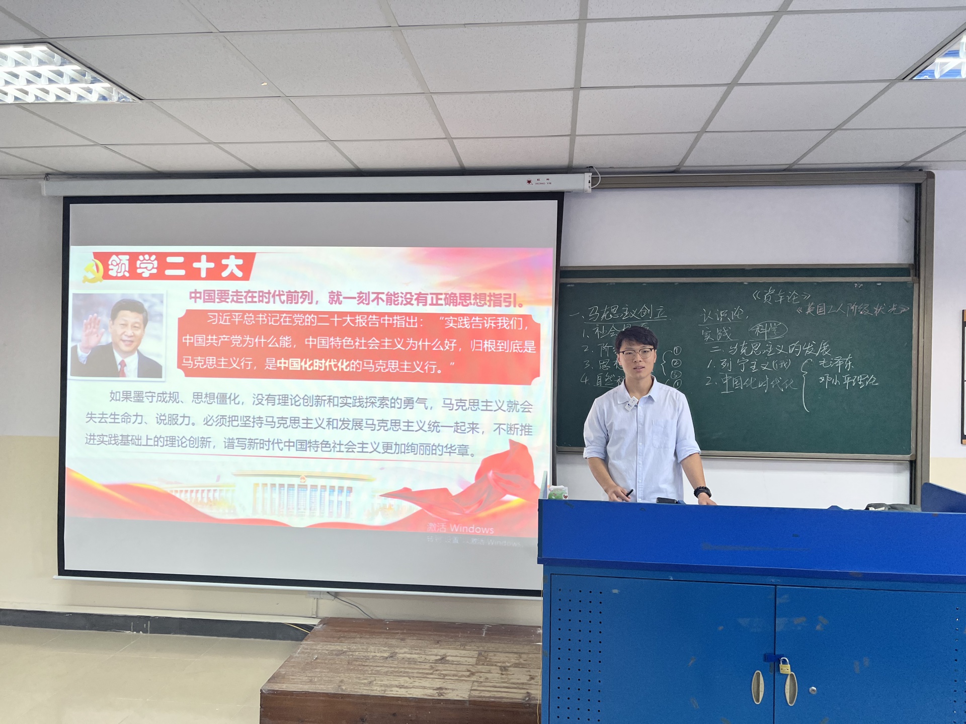 新进教师唐浩将二十大报告精神融入原理课,以新时代的历史背景和具体实践向员工展现习近平新时代中国特色社会主义思想对马克思主义理论的守正创新。