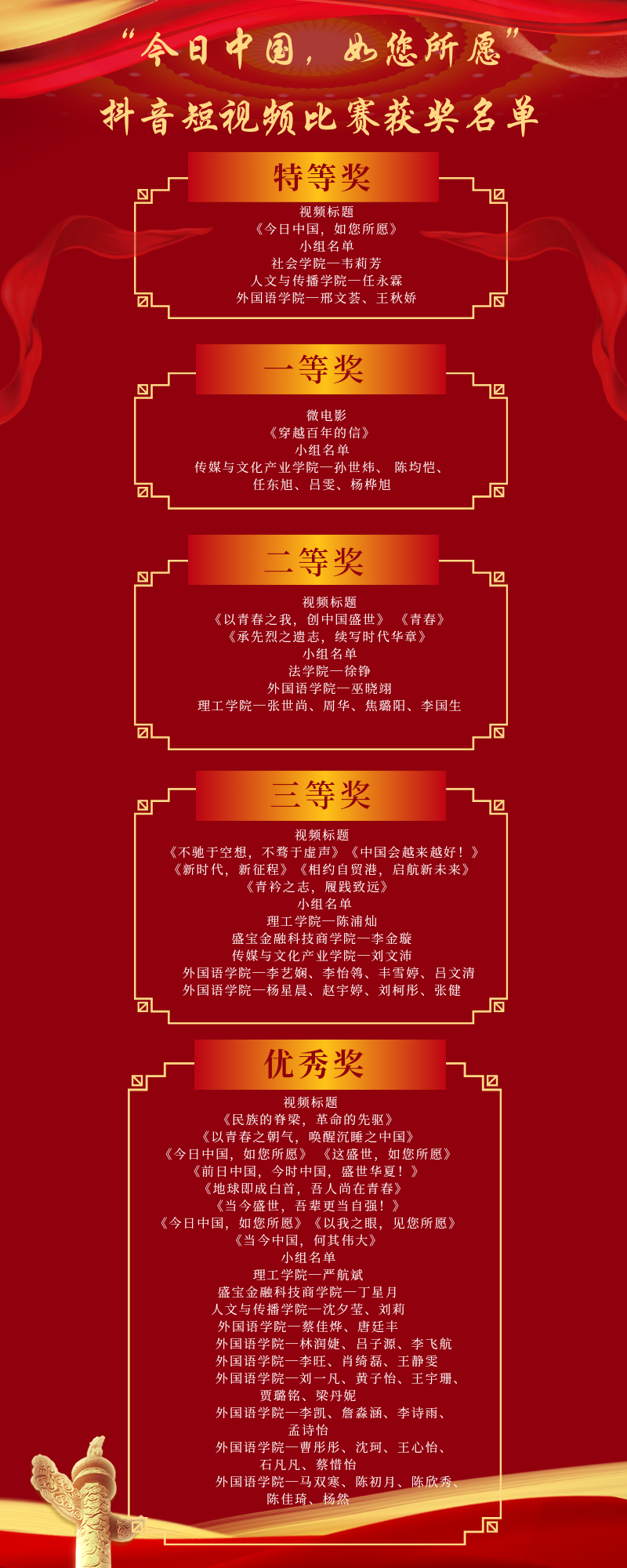 最终,人文与传播学院任永霖、社会学院韦莉芳与外国语学院邢文荟、王秋娇团队制作的视频《今日中国,如您所愿》获得特等奖,传媒与文化产业学院孙世炜、 陈均恺、任东旭、吕雯、杨桦旭团队拍摄的微电影《穿越百年的信》获得一等奖,另有三个团队获得二等奖,五个团队获得三等奖,十个团队获得优秀奖。从4月28日开始,获奖作品在学院官方抖音号【Usymarx】平台陆续展示。