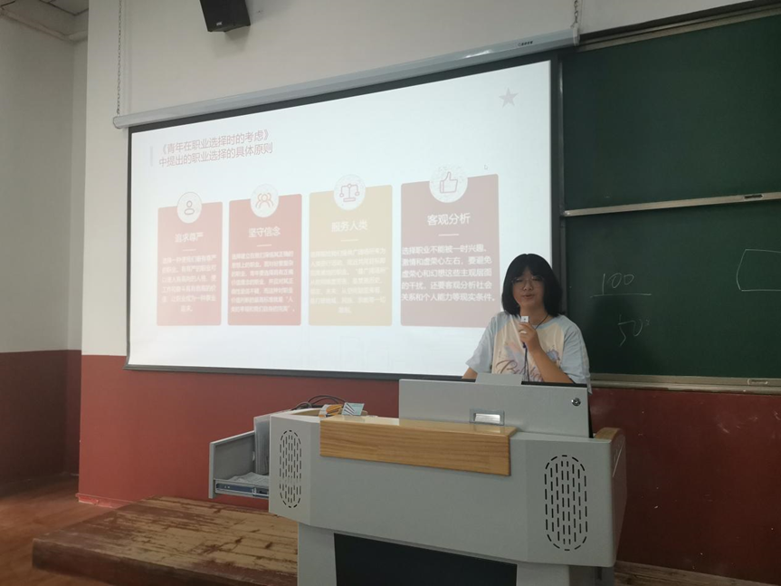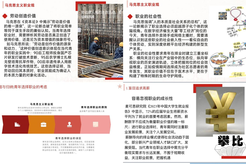 朱珂慧同学作为PPT讲述者,从马克思主义职业观的角度,首先阐释了劳动创造价值的观点,再结合具体事例,如95后农学院博士扎根戈壁,培育抗旱作物等,论证了劳动的重要性。在这个过程中,朱珂慧同学运用图文和视频的方式着重讲述了黄文秀的故事,这为青年人们的职业选择明确了方向。正如马克思的职业观所论述的,职业选择应遵循"人类的幸福和自身的完美"双重维度,强调个人理想与社会价值的辩证统一。